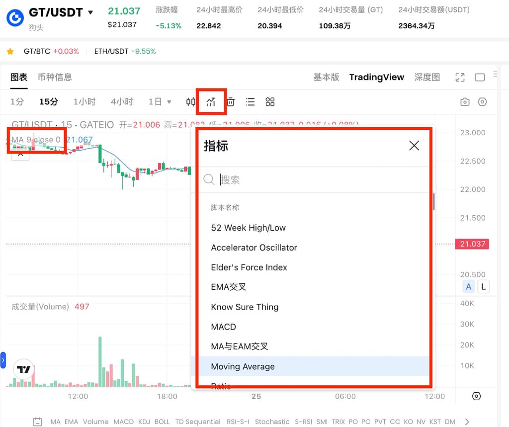 2、点击指标可选择需要的K线指标,以均线为例: