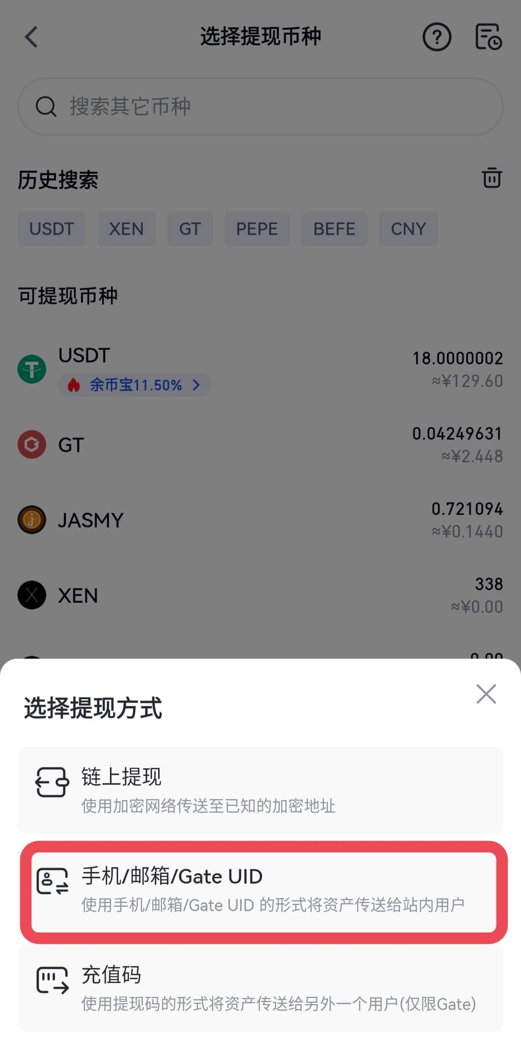 1. 登录 Gate 个人账户,点击导航栏“资产”——“提现”——搜索点击要提现的币种——“手机/ 邮箱/ Gate UID”。