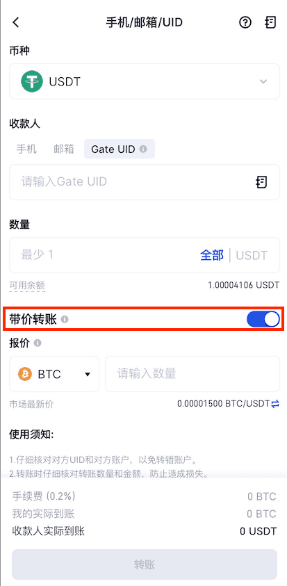 3. 若欲与其他用户进行币种的转账同时进行交易,在“手机/ 邮箱/ Gate UID 页面”可打开“带价转账功能”,转账者可设置转账数量及报价,收款者将支付相应对等数量的币种