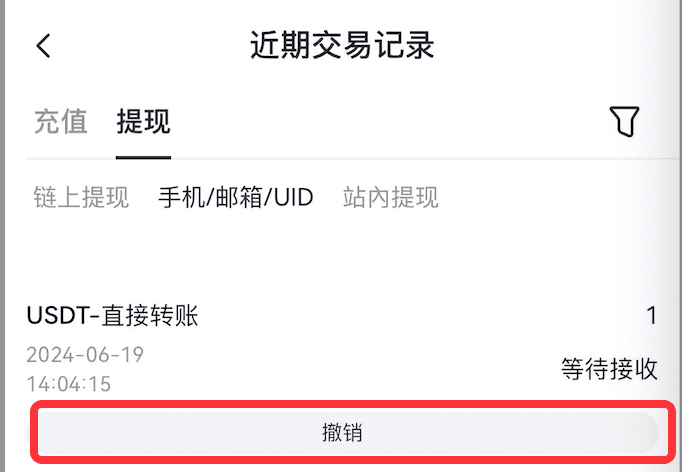 5. 转账成功后,可在提现界面点击右上方的“笔记本”标志,进入“近期交易记录”—“提现”-手机/邮箱/UID” 中查看转账详情;