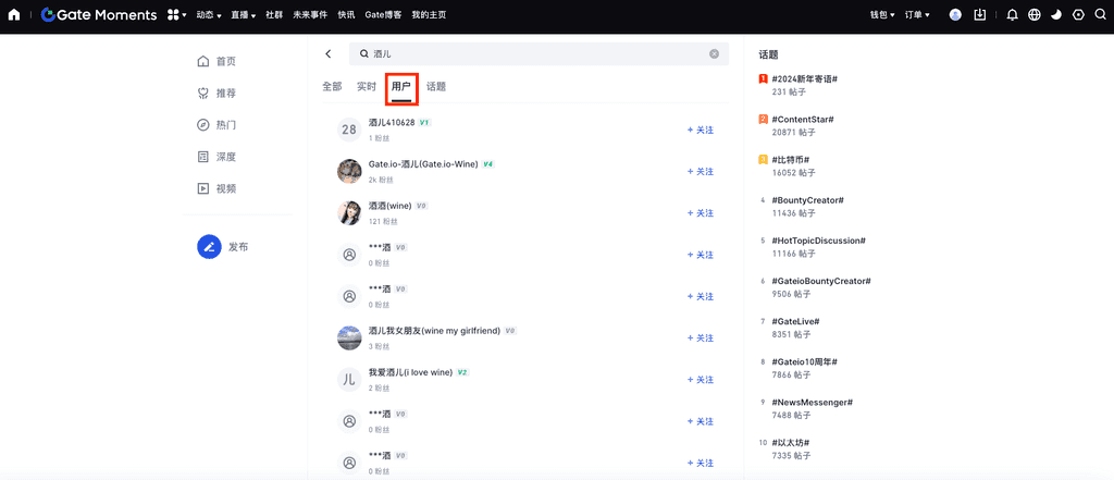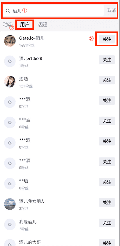 以搜索用户昵称“Gate-酒儿”为例: