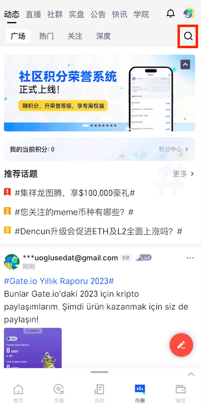 1、打开Gate App,登录个人账户后,点击页面底部“币圈”——“动态”——点击右上角“搜索”。