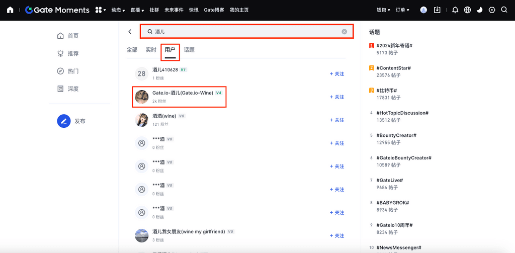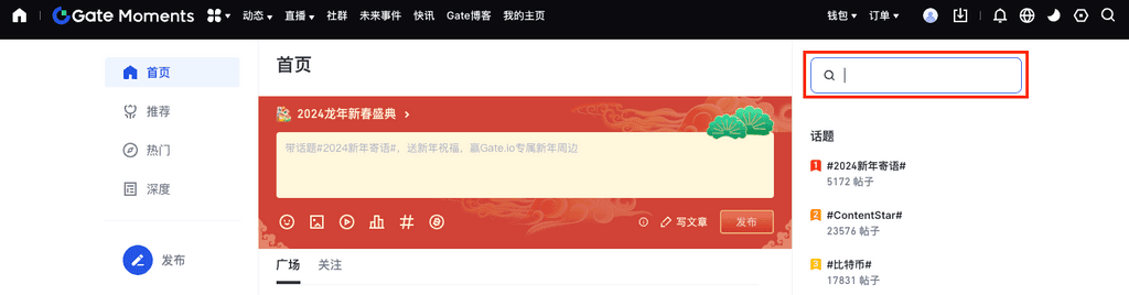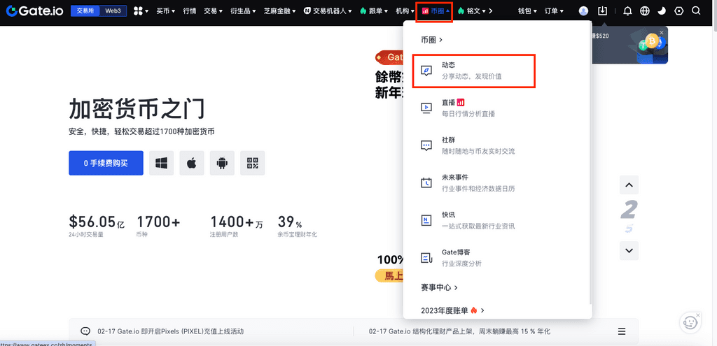 1、登录Gate个人账户——点击导航栏“币圈”——“动态”。