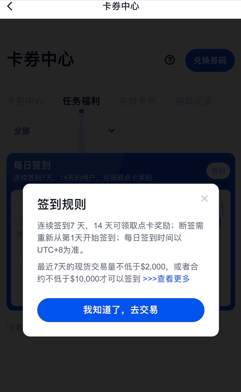 2.近7天的现货交易量达到$2,000,或合约交易量达到$10,000,才可进行签到;交易量=买入+卖出。