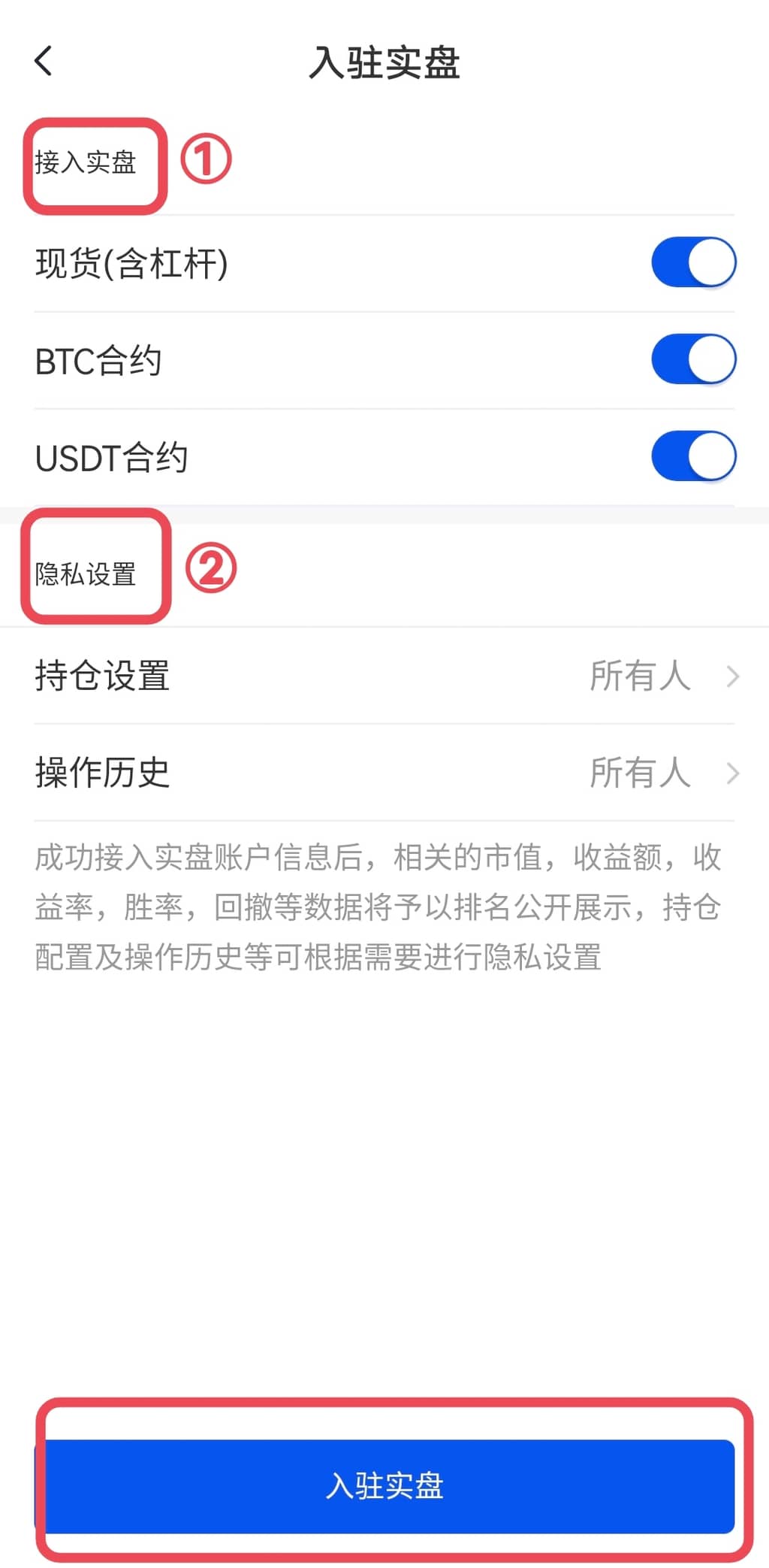 ①选择开启或关闭“接入实盘”类型:现货(含杠杆)、BTC合约、USDT合约