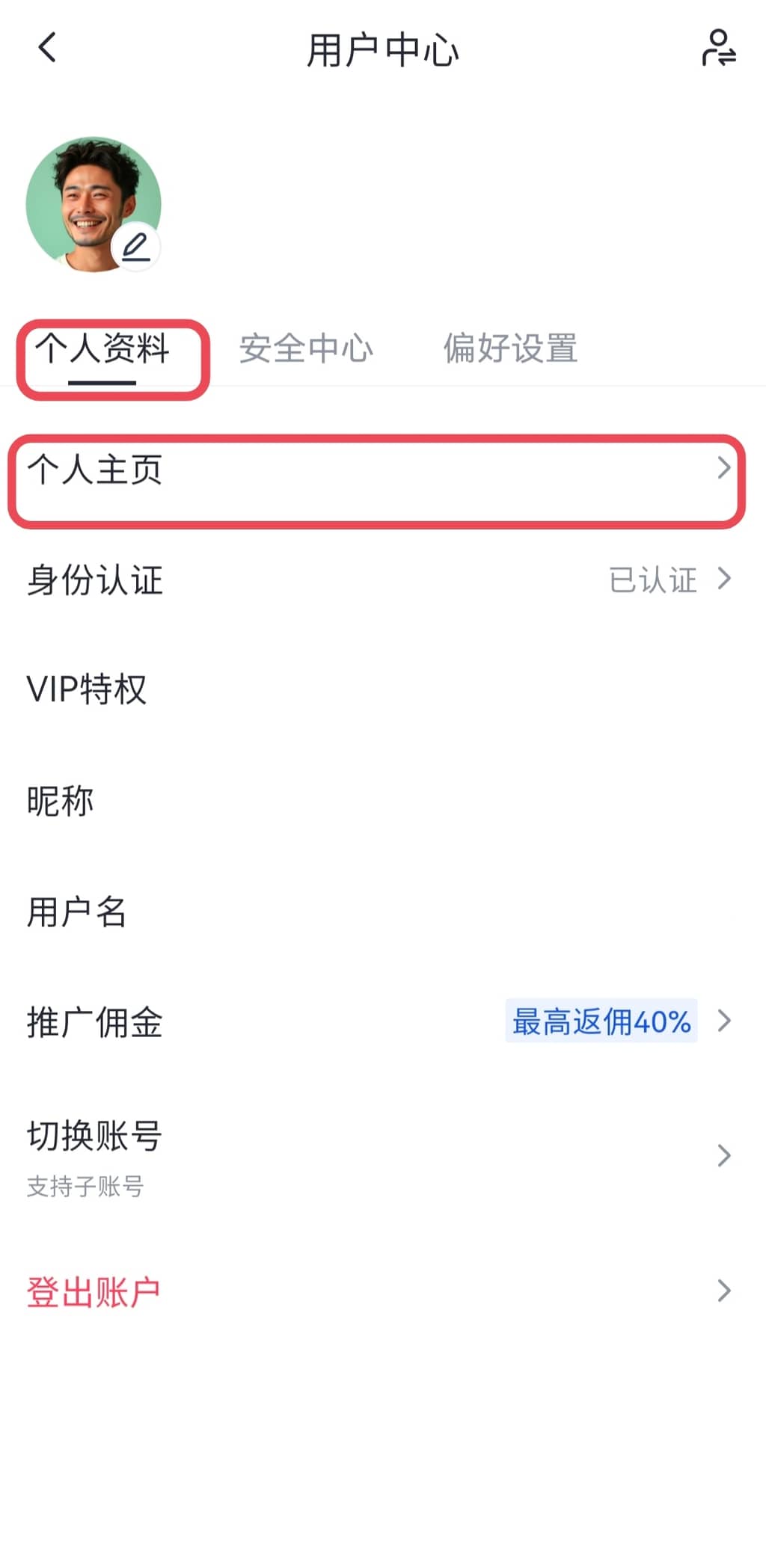 ①登录个人账户,点击左上角头像,再点击头像右侧的右箭头标识,进入“用户中心”,点击“个人资料”中的“个人主页”。