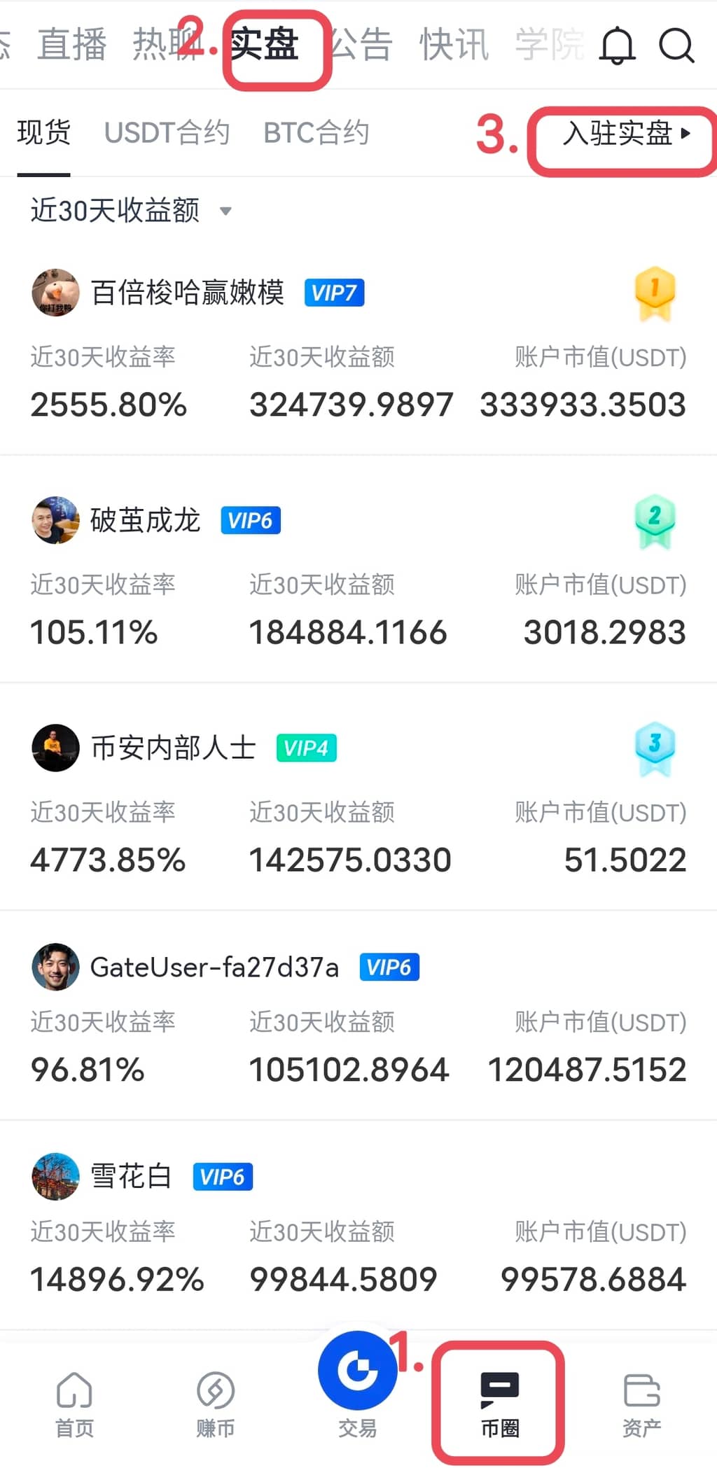 登录个人账户,点击页面底部“币圈”——“实盘”——“入驻实盘”。