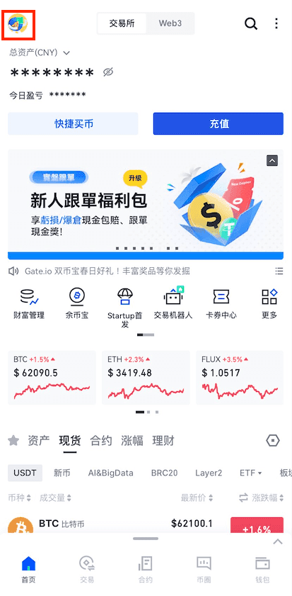 1、打开Gate App,点击左上角头像,再点击头像右侧的右箭头标识。