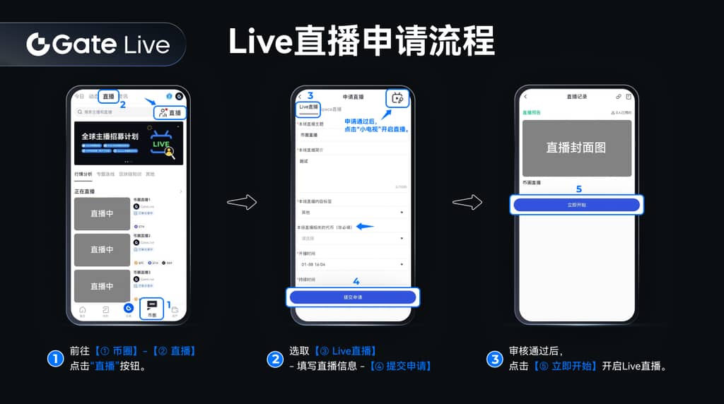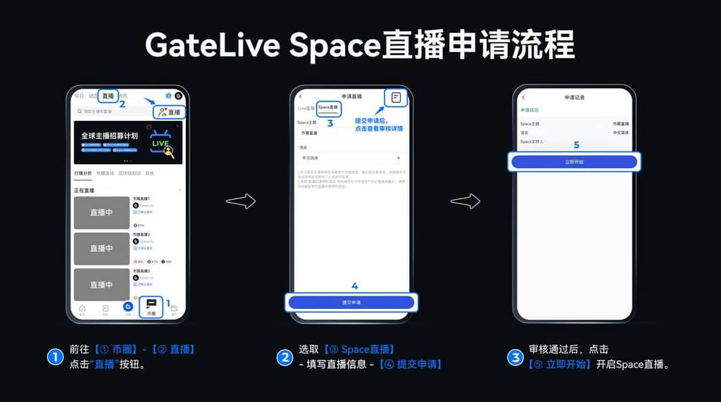 GateLive直播平台为主播提供了便捷的直播申请与开播指南,主播可通过点击申请链接提交Live或Space直播申请,审核通过后可在指定页面开始直播,直播内容需与相关代币标签关联,以提升曝光度,封面图需符合行业规范并突出主题,主播在直播中应注意不展示个人社交信息及其他平台内容,确保直播内容合规,且可通过手机或PC端进行直播,支持多种互动功能如评论、打赏等,主播可通过设置订阅功能获得收益,此外,平台提供了丰富的主播扶持政策及实时收益结算,确保主播在直播过程中获得良好体验,若有违规行为将受到相应处理,更多信息可访问GateLive官网。