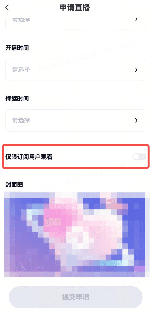 注:若需直播权限设为“仅限订阅用户观看”,只需升级app到最新版本,在「申请直播」页面开启“仅限订阅用户观看”选项(需要开通订阅功能才可使用设置“仅限订阅用户观看”)。