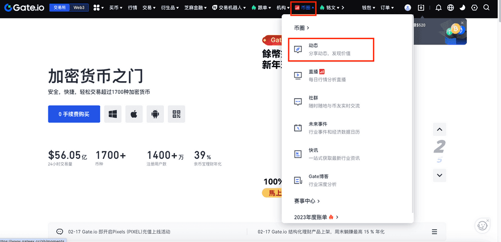 1、登录Gate个人账户—点击“币圈”—“动态”。
