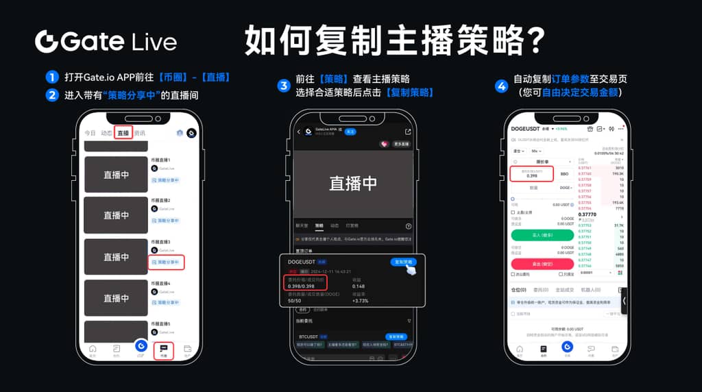 在Gate APP中,主播可以通过简单的步骤分享交易策略,首先在直播间点击策略设置,选择可分享的委托单类型并确认,用户则可在策略列表中查看主播的委托单详情,点击复制策略后自动跳转至交易页并复制订单参数,用户在选择合适策略后可自由决定交易金额,此外,GateLive直播为用户提供实时市场动态,助力捕捉财富新机会,支持超过1,700种加密货币的安全、快捷交易,下载Gate App或电脑客户端,关注社交媒体获取福利,加入社群讨论热点话题,获取最新资讯,注册新用户还可享受丰厚的迎新礼,老用户邀请他人注册可获得佣金,尽享加密货币交易的便捷与乐趣。