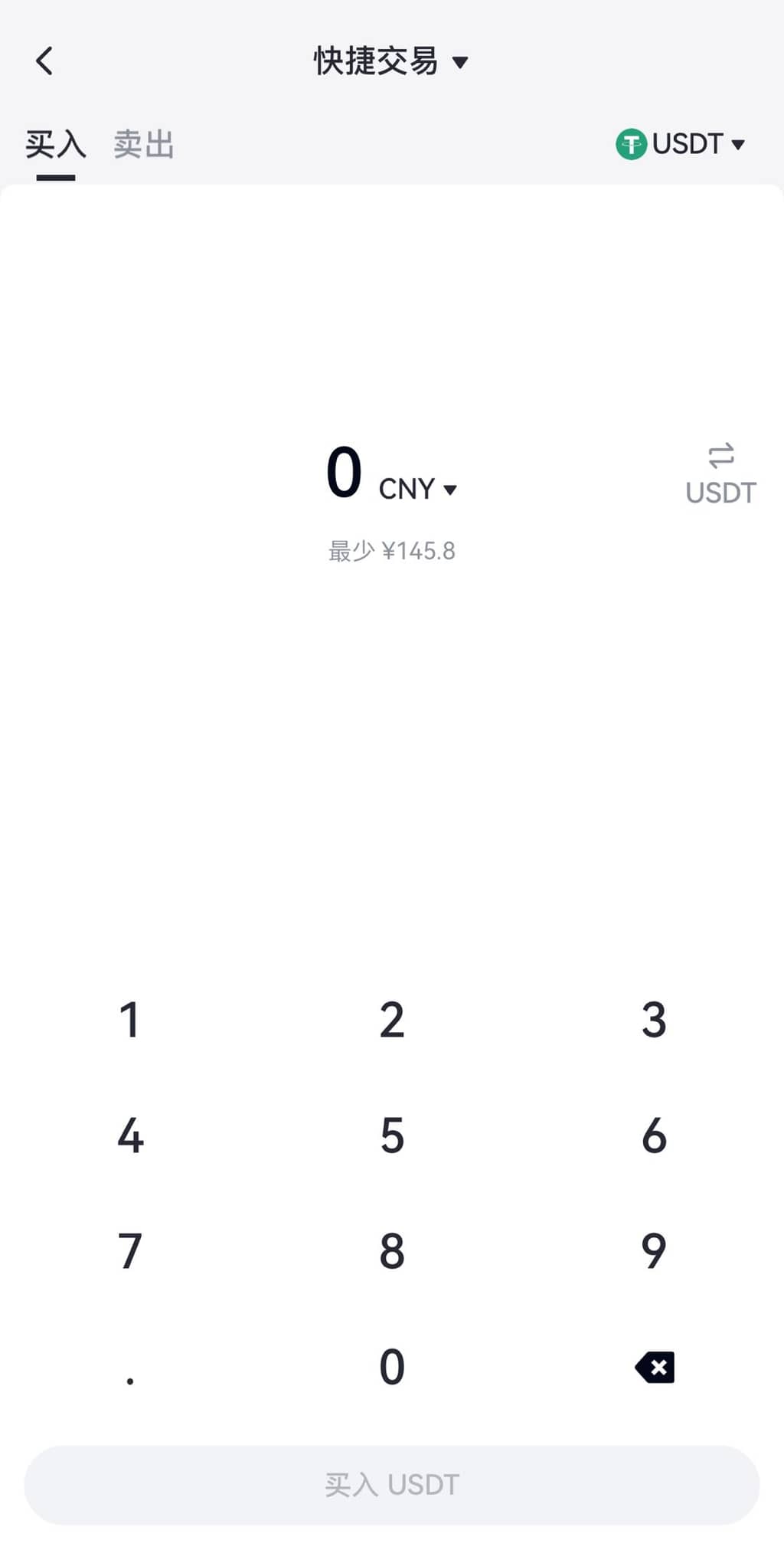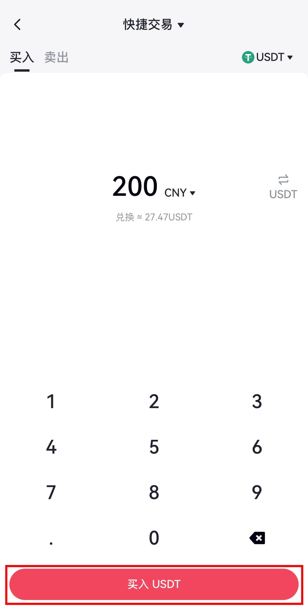 币种选择USDT,输入买入金额,会自动显示可得到币种的数量,点击“买入USDT”。