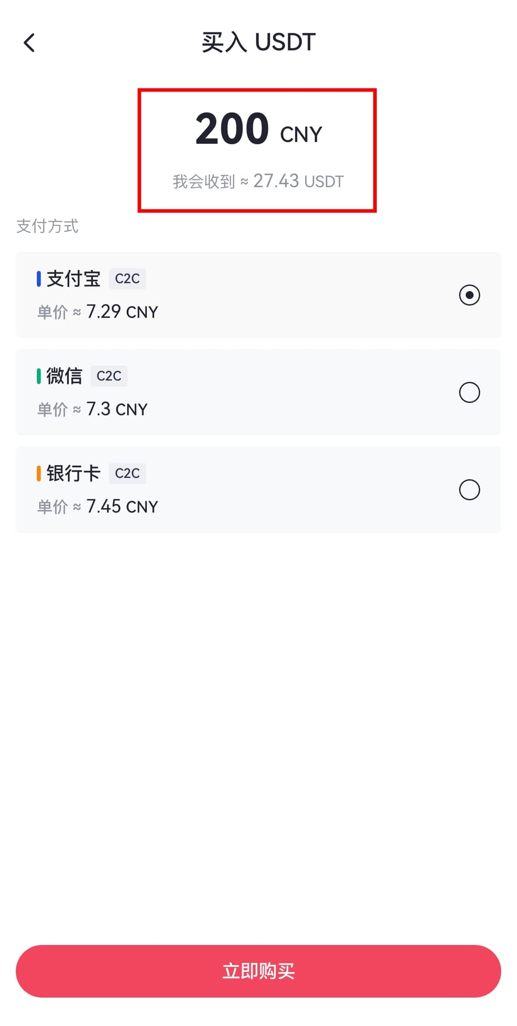 3.选择付款方式,核实确认交易信息无误后,点击“立即购买”,匹配订单。
