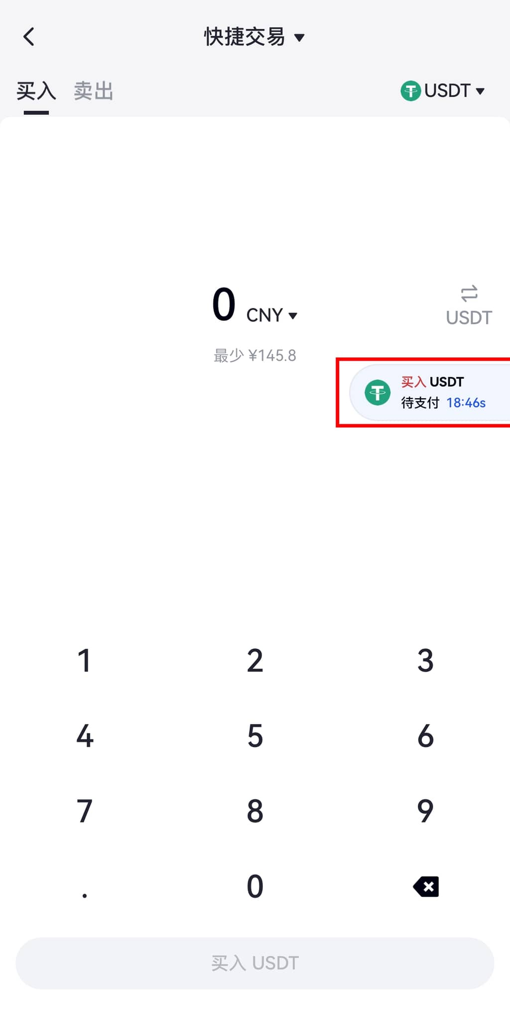 4.系统会根据您的要求,自动匹配订单。匹配成功后,在快捷买入页面右侧会显示 “待支付”,点击进入可以查看支付详情并进行支付。