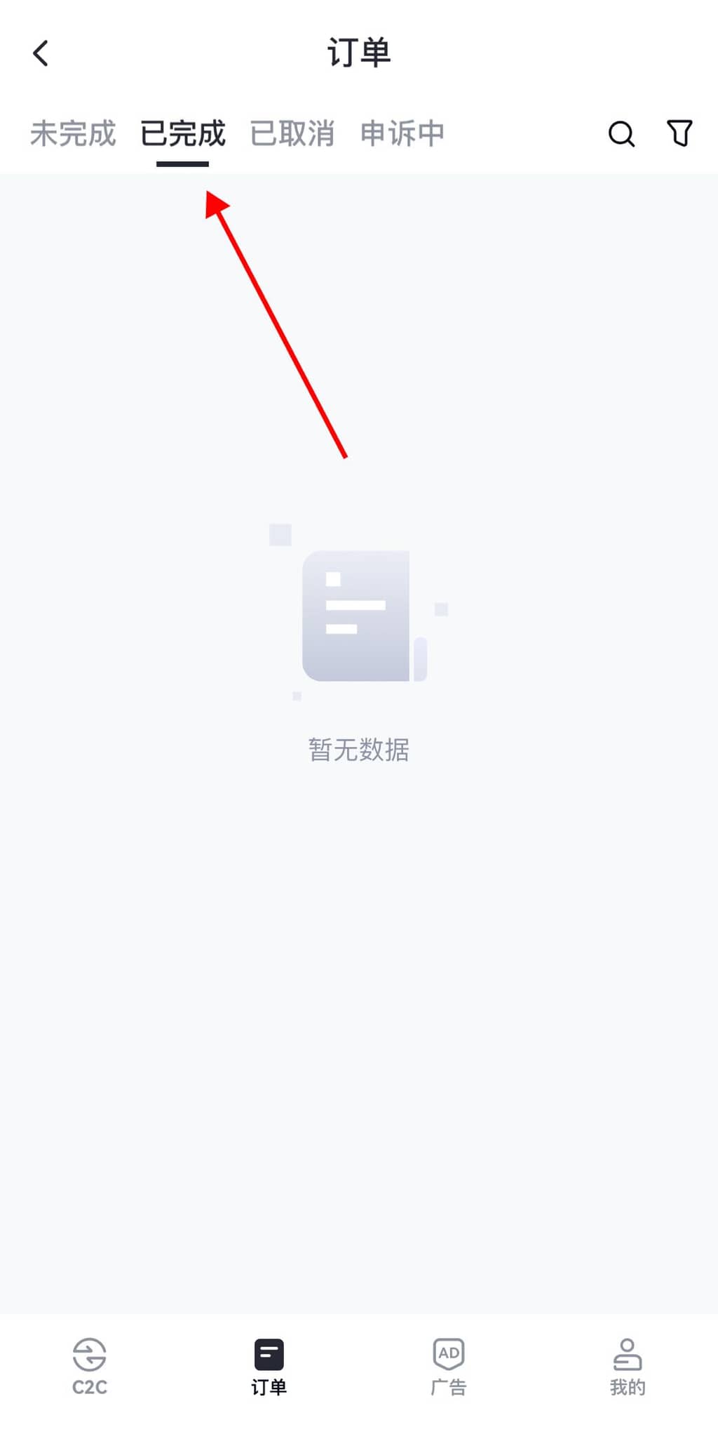 如果您是普通用户,您也可以点击页面上方“快捷交易”切换到“C2C”界面,右上角点击 “笔记本” 标识可以查看到订单,也可以点击“未完成”“已完成”“已撤销”“申诉中”查看到不同状态的法币订单。