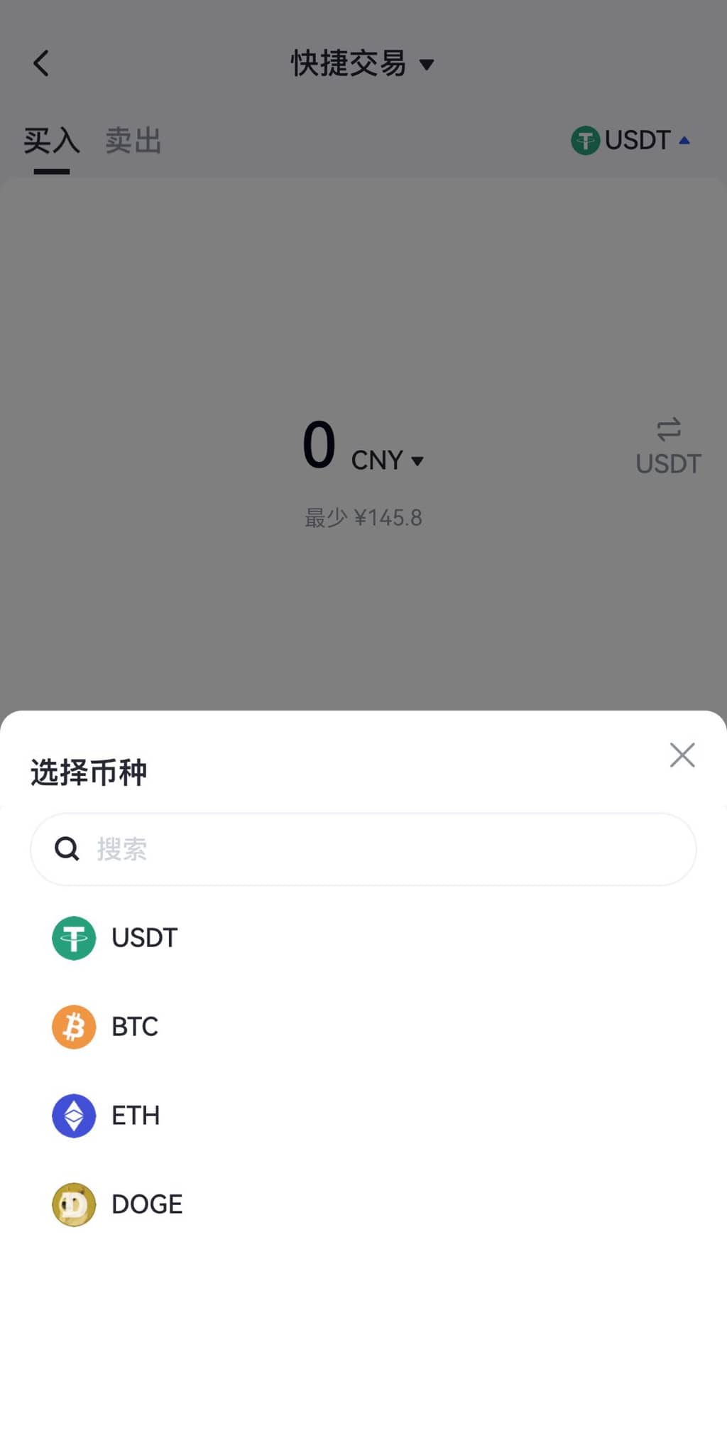 2.点击 “快捷买币” 后,会直接跳转到 “快捷交易” 页面,点击“买入”,选择买入的币种(USDT/BTC/ETH/DOGE),买入方式可以选择按购买金额或获得数量买入。