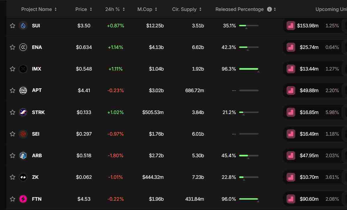 在即将解锁的项目中,Sui(SUI)、Fasttoken(FTN)、Arbitrum(ARB)和Aptos(APT)是释放规模最大的几个代表。这些项目的解锁事件无疑将成为九月加密货币市场的焦点。