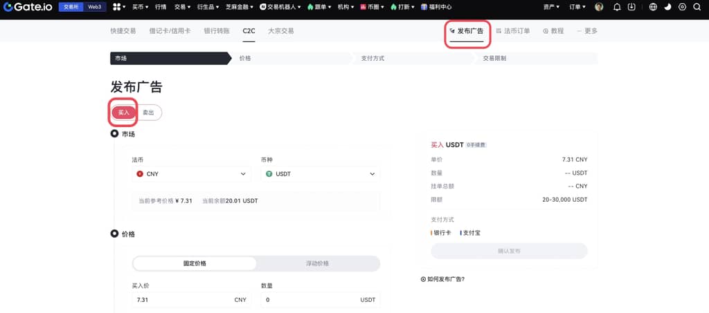 进入法币交易页面,点击右上角“发布广告”——“买入”。