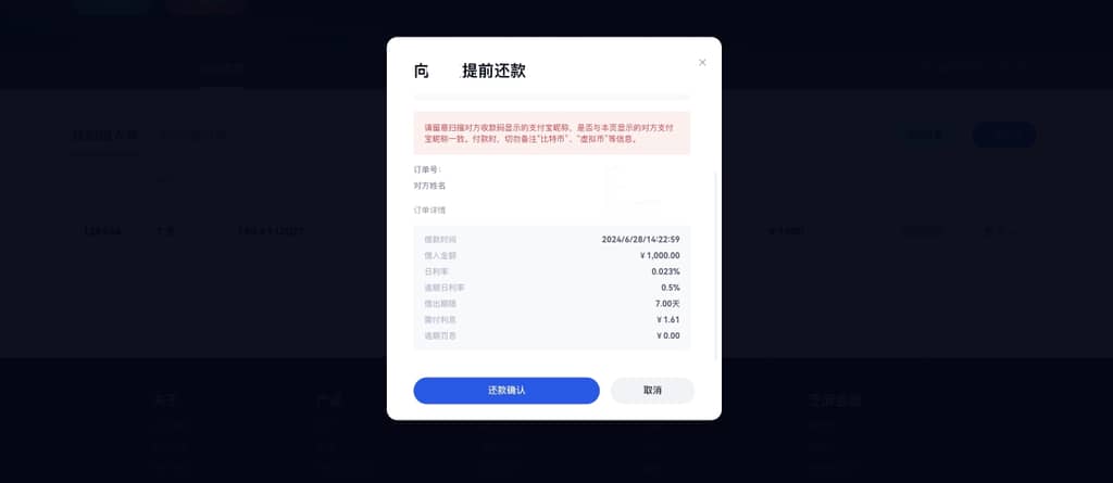 5.借入后次日可以进行还款。如需提前还款,可在借款次日至还款日24点前进行还款,点击“提前还款”,仔细核对借出方的收款账户信息后,手动转账借款及利息至借出方账户以后,点击“还款确认”。