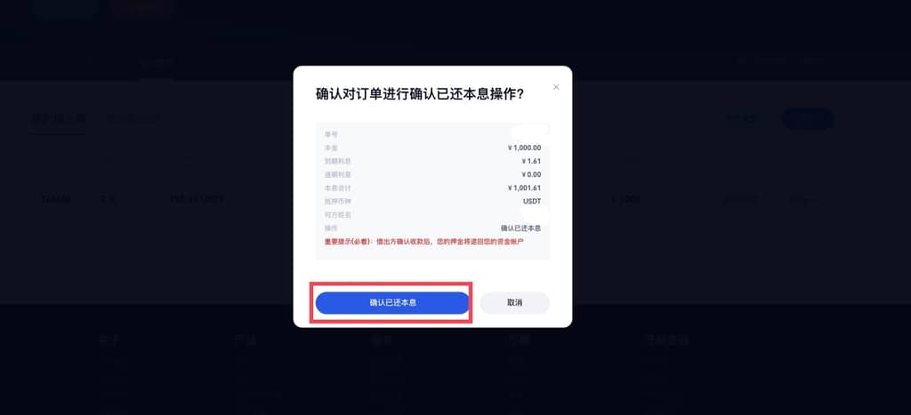 确认本息还款完毕,核对信息无误后,点击“确认已还本息”,页面详情如下: