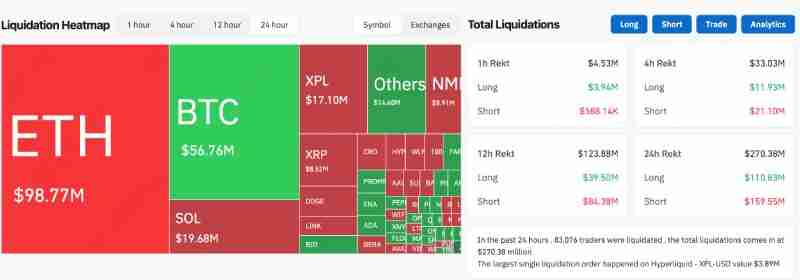 期权市场的轧空效应成为最直接的推动力。8 月 27 日 Coinglass 数据显示,市场在 24 小时内爆仓金额高达 2.70 亿美元,且主要集中在空头仓位。大量看空 ETH 的投资者被迫平仓,加剧了价格的上冲动力,使得行情演变成一场空头踩踏。