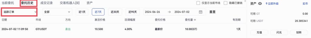 用户小张有10 GT,目前GT价格还在上涨,小张想在价格回调时高价卖出,可以设置追踪订单追踪价格走势。如图设置:回调幅度4%,激活价格10.5 USDT,委托价为最新价,卖出10GT,有效期1天,不开启下单即撤。点击卖出:
