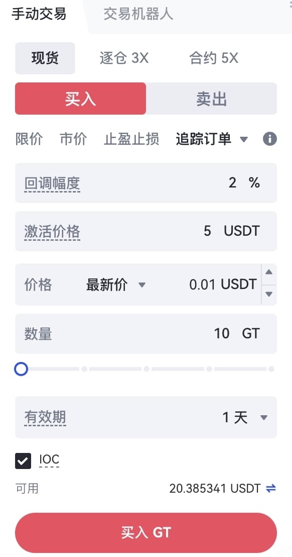 假设最近GT价格下跌,用户小王想等价格反弹时低价买入些,可以使用追踪订单追踪价格走势,在反弹上涨之前买入GT。如图设置:回调幅度2%,激活价格5,委托价为最新价格-0.01USDT,买入量10 GT,有效期1天,开启下单即撤。点击买入: