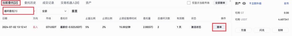 最近GT价格上下波动比较频繁,用户小王看涨想利用波段套利,可以使用循环委托订单。假设GT目前最新成交价格为4.75USDT,用户设置: