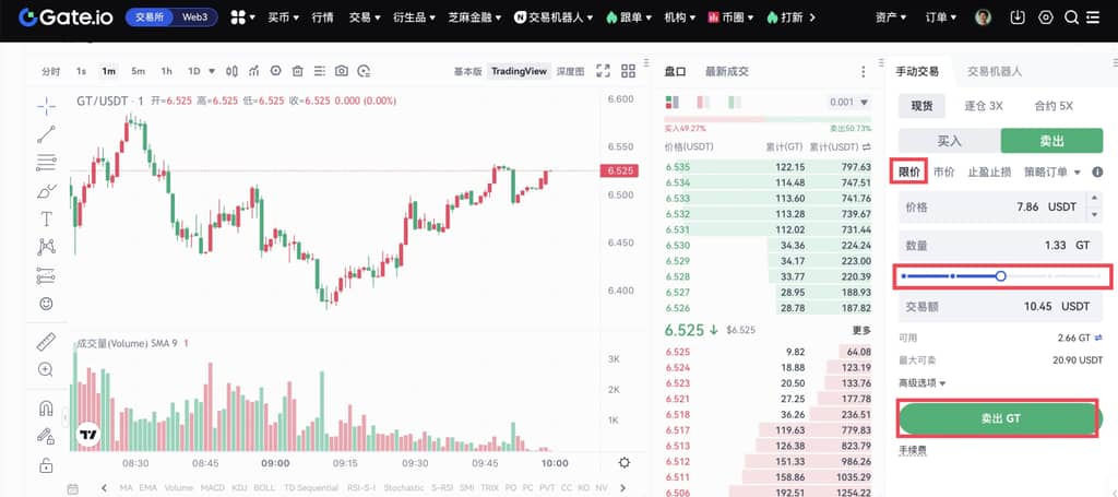 以图3为例:假设您想要以7.86 USDT的价格卖出GT,您可以在【现货交易】面板选择【限价】,设置卖出价格为7.86 USDT,卖出的数量可以直接在【卖出量】输入数字,也可以拉动下方百分比条形栏,选择想要卖出GT的比例,如图所示,【我的余额】显示我还有2.66GT,我想卖出其中的50%,我就可以将百分比选为【50%】,系统会自动计算卖出GT的数量及可兑换的USDT金额。