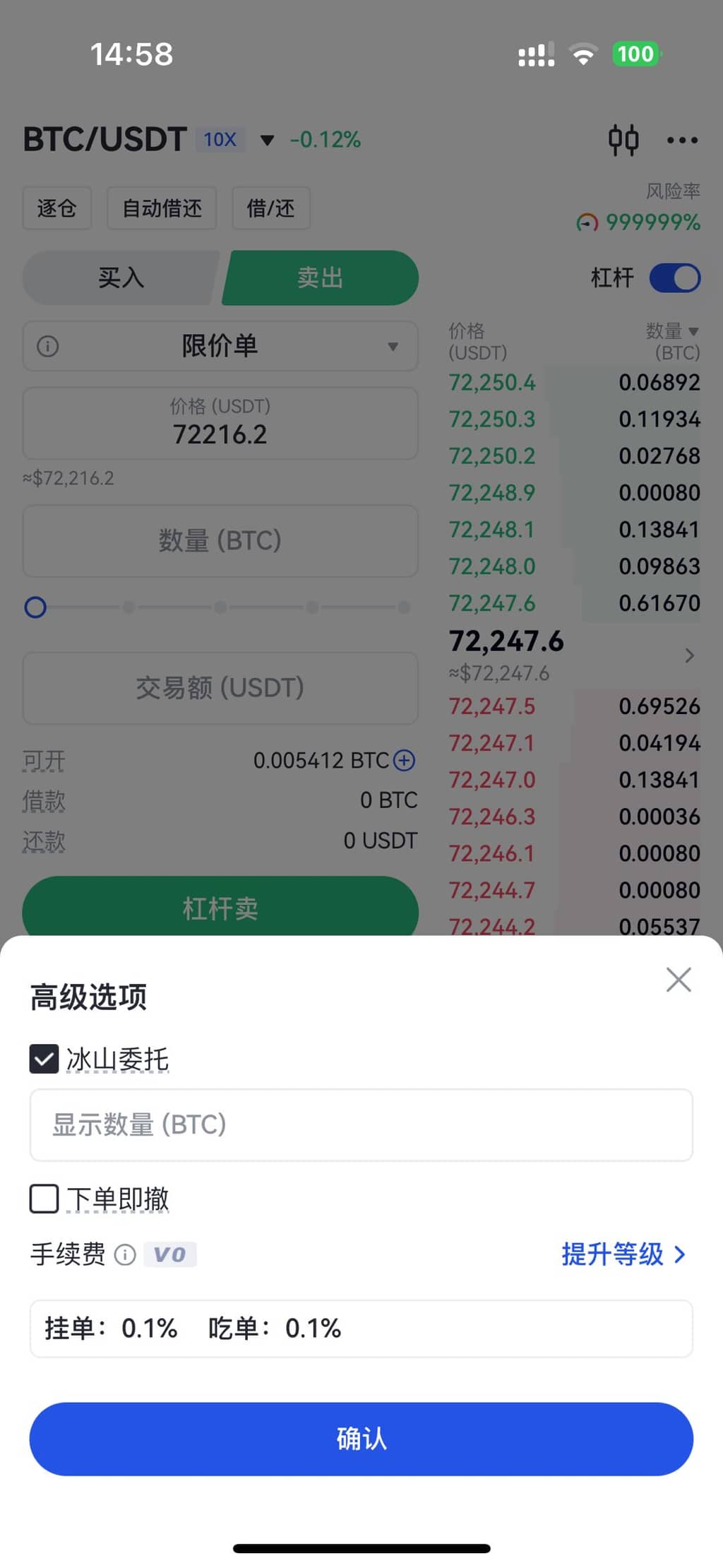 - 进入现货/全仓/逐仓下单页面。选择限价单点击“高级委托”选项,选择“冰山委托”类型。
