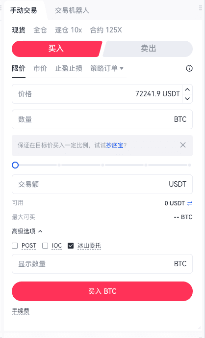 - 进入现货/全仓/逐仓下单页面。选择限价单,点击“高级委托”选项,选择“冰山委托”类型。