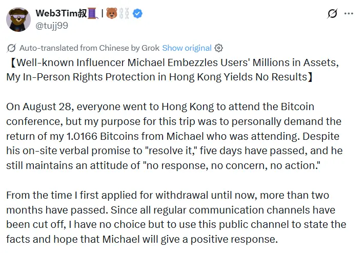 huangt 消息,据 X 平台用户 Web3 Tim 叔,公开发文,其自 2021 年起在 KOL Michael 的直播中购买矿机并追加资金,累计投入超 14 万美元。2025 年 6 月,该用户支付 3.6 万余美元电费后申请提币 1.0166 枚 BTC ,但始终未能成功。