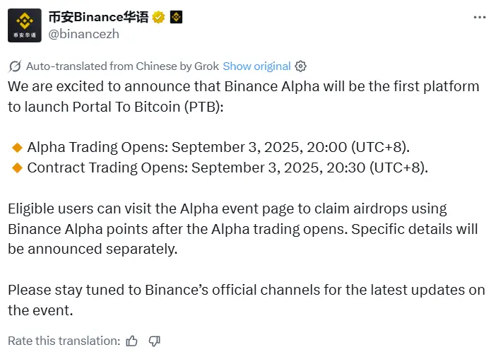 huangt 消息,币安宣布币安 Alpha 是首个上线 Portal To Bitcoin ( PTB )的平台 。 Alpha 交易于 2025 年 9 月 3 日 20:00( UTC +8)开放,合约交易于 2025 年 9 月 3 日 20:30( UTC +8)开放 。