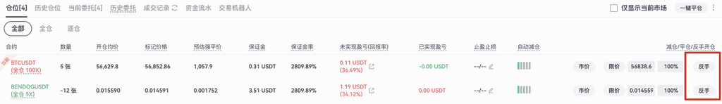 - 在合约 “仓位” 处右侧可以看到 “反手” 按钮