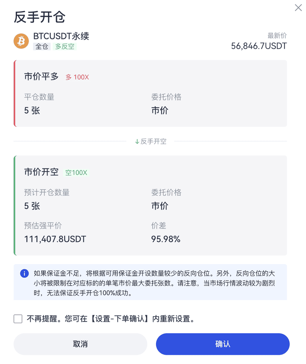 核实弹窗内信息:当前合约交易对、反手开仓方向、委托价格、委托数量等