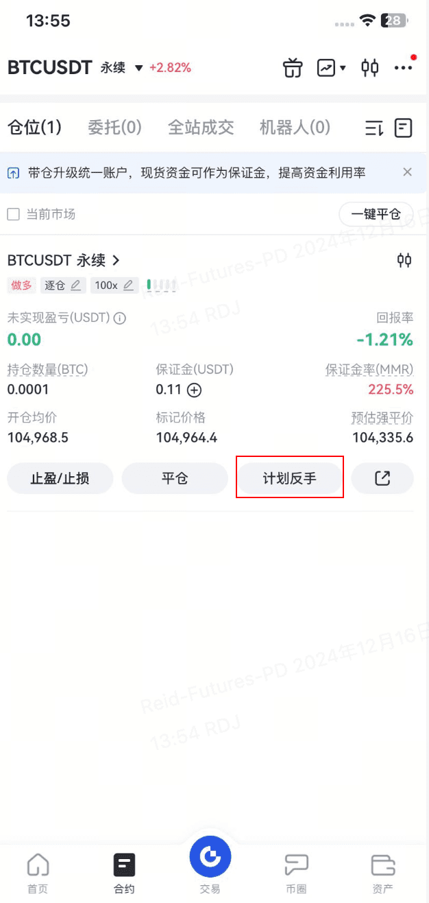 - 在合约 “仓位” 处右侧可以看到 “计划反手” 按钮