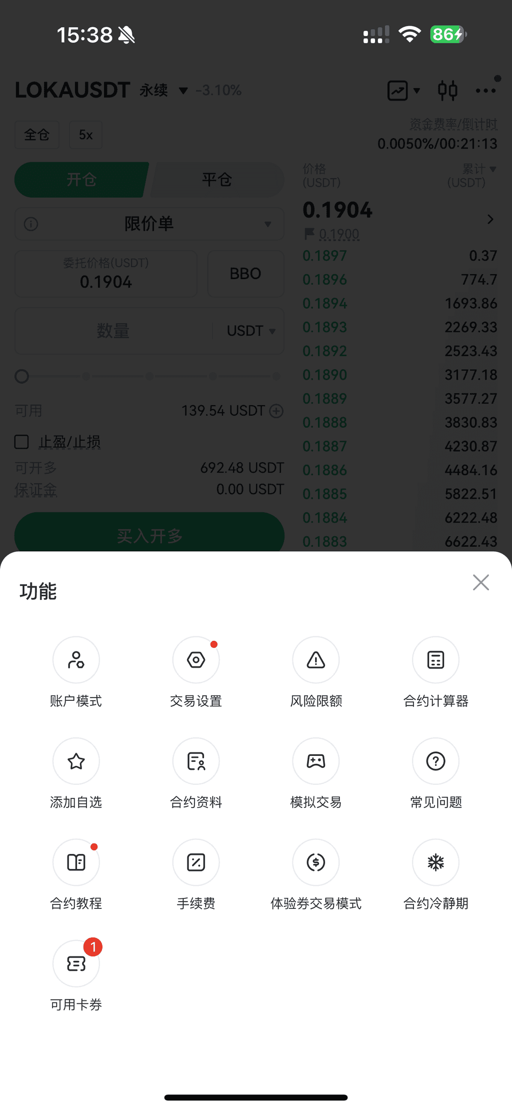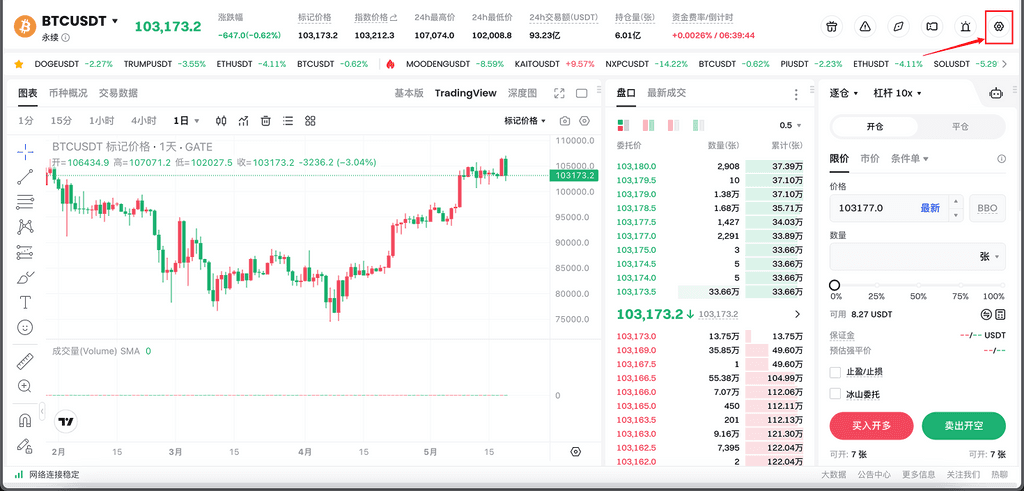 - 进入【合约】页面,点击右上角的【交易设置】。