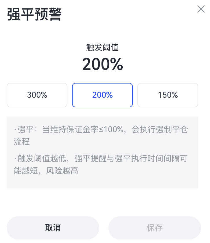 - 在弹出的【强平预警自定义】窗口中,您可以选择【300%】、【200%】或【150%】作为保证金率的预警阈值。默认为【200%】。