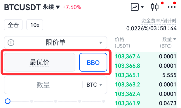 BBO(best bid and offer) 也叫最优买卖价,BBO订单属于限价单中的一种类型。它允许交易者快速设置与盘口最优的对手价一致的限价单价格,从而更快的执行订单。