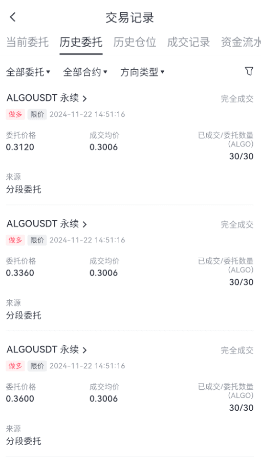 已完成或已撤销的分段委托子订单都会进入【委托历史】中,可以查看委托历史记录。可在【历史委托-限价|市价委托】列表中查看分段委托的订单信息;