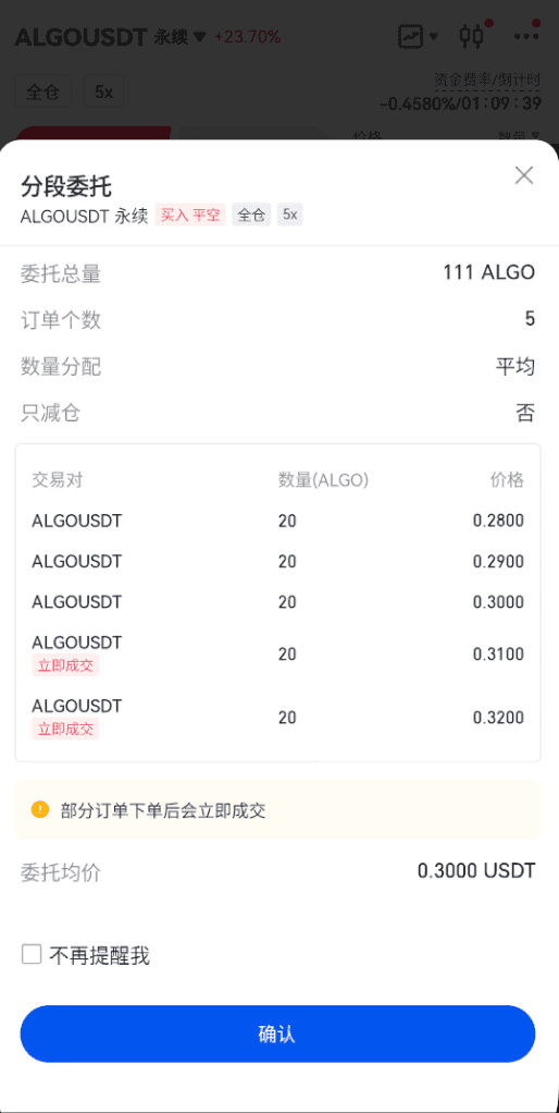 请注意,如果当前市价优于子订单价格,在分段委托预览中立即成交的子订单会有“立即成交”标识。