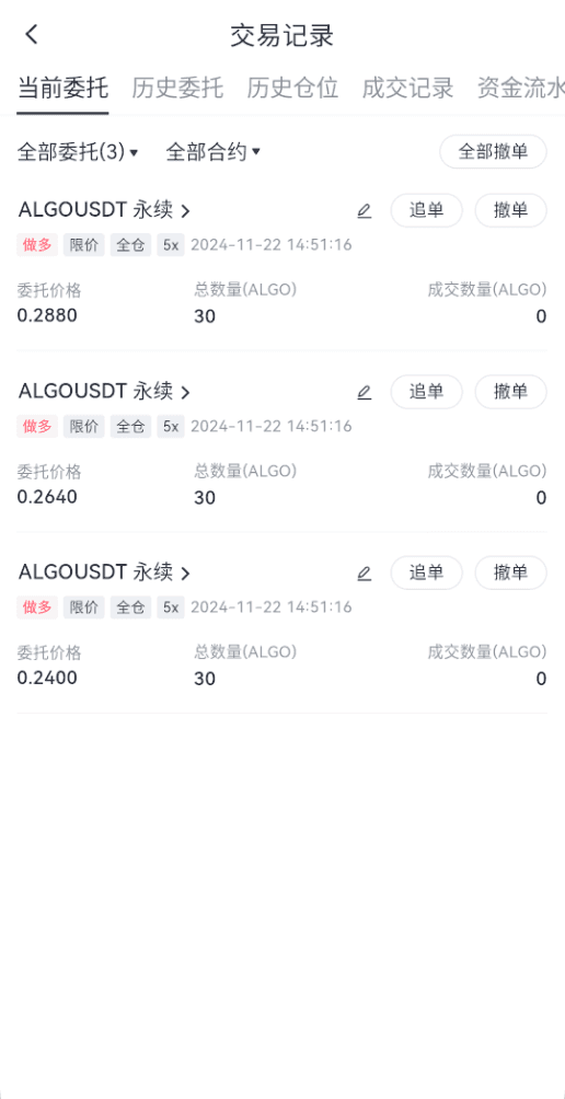 已完成或已撤销的分段委托子订单都会进入【历史委托】中,可点击交易页面下方“当前委托”最右侧的“账单”图标,可以查看历史委托记录。下图为分段委托订单的历史委托信息: