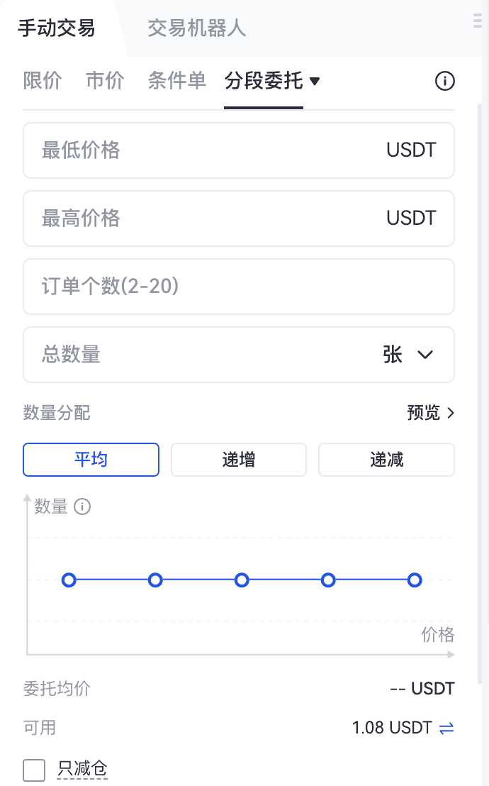 分段委托适用于所有永续合约交易(包括USDT本位和BTC本位)。分段委托支持用户设置指定的价格区间,并在此区间内按照指定的数量分配模式一次性下单多笔限价委托。