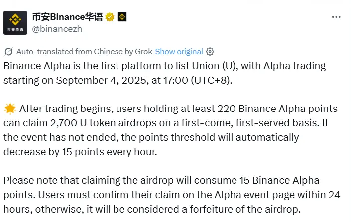 huangt 消息,据报道,Binance Alpha 是首个上线 Union(U)的平台,其 Alpha 交易将于 2025 年 9 月 4 日 17:00(UTC+8)开启。用户需在 24 小时内前往 Alpha 活动页面确认领取空投,否则将被视为放弃该空投资格。