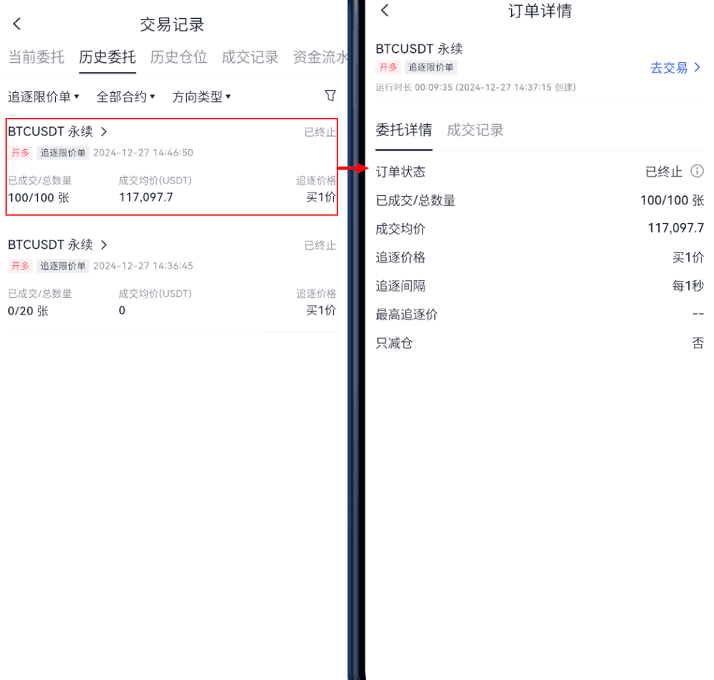 已完成或已撤销的追逐限价单都会进入【历史委托】中,可在历史委托中点击追逐限价单,查看追逐限价单的历史记录。下图为追逐限价单历史委托信息:
