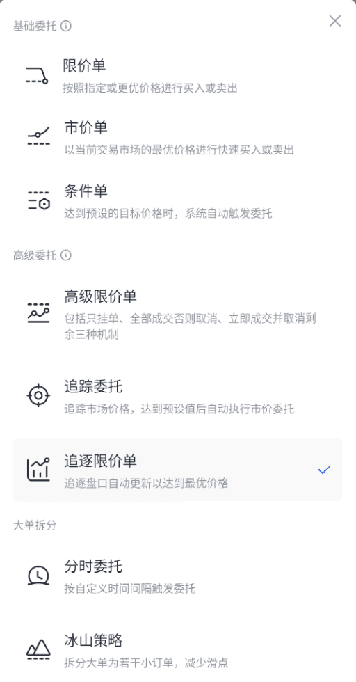第1步:进入交易界面后,选择您想下单的交易对,然后在下单区点击展开更多委托方式,选择“追逐限价单”;