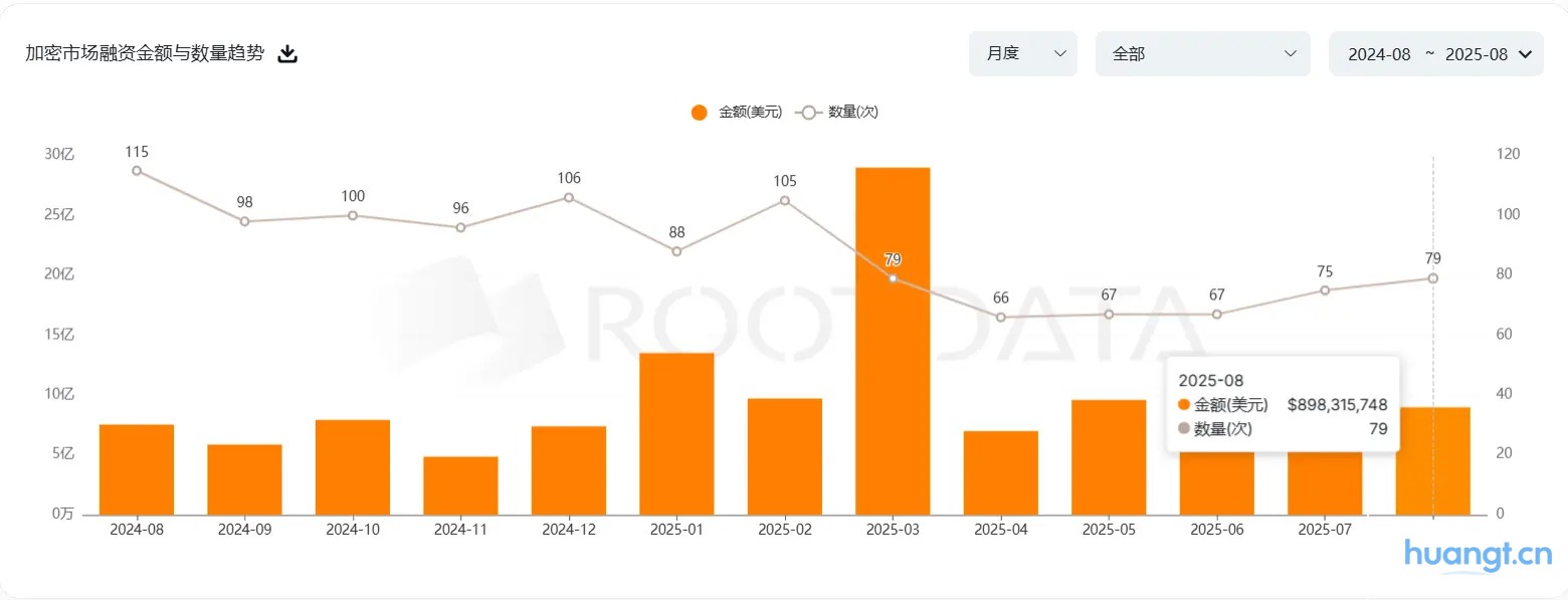 huangt 消息,据加密数据平台 RootData 统计,2025 年 8 月加密市场共披露 79 起投融资,合计约 8.98 亿美元,金额环比下降约 23.5%。
