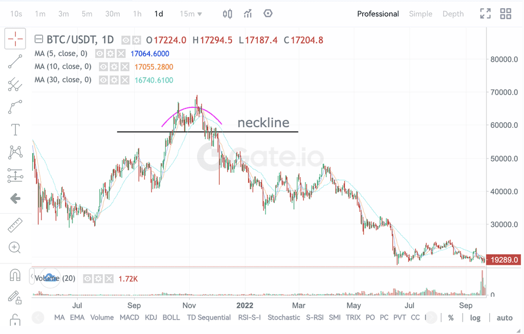 上图是 BTC 日线图,在 2021.10.1 至 2021.12.5 期间,经过一段比较急速的上涨后,多方力量趋弱,涨势缓和。而空方力量增强,多空双方力量势均力敌,开始横盘,在第二次冲击未破前高后,开始缓慢回落,形成圆顶。随着一波凌厉暴跌,币价击穿颈线,至此拉下下跌趋势大幕。在长达 1 年的下跌过程中,跌幅达 70% 以上。