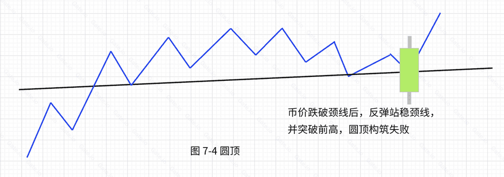 当币价在跌破圆顶颈线不久便再次回升至颈线上方,下破颈线失败,圆顶构筑失败。此时,可持仓继续观望,结合趋势指标再决定是否离场。